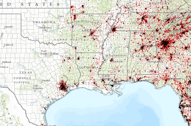 A map showing urbanization projections for several southeastern states. The map also includes data layers for states, counties, and terrestrial conservation areas.